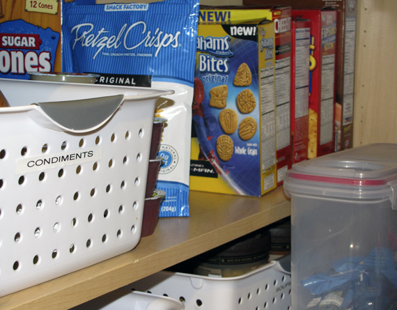 I used one of the baskets to store our bread (hamburger buns, hot dog buns, sandwich bread, etc.), and the others for condiments, soups and salsa. To make it easy for my husband to find things, I labeled each basket with its contents.